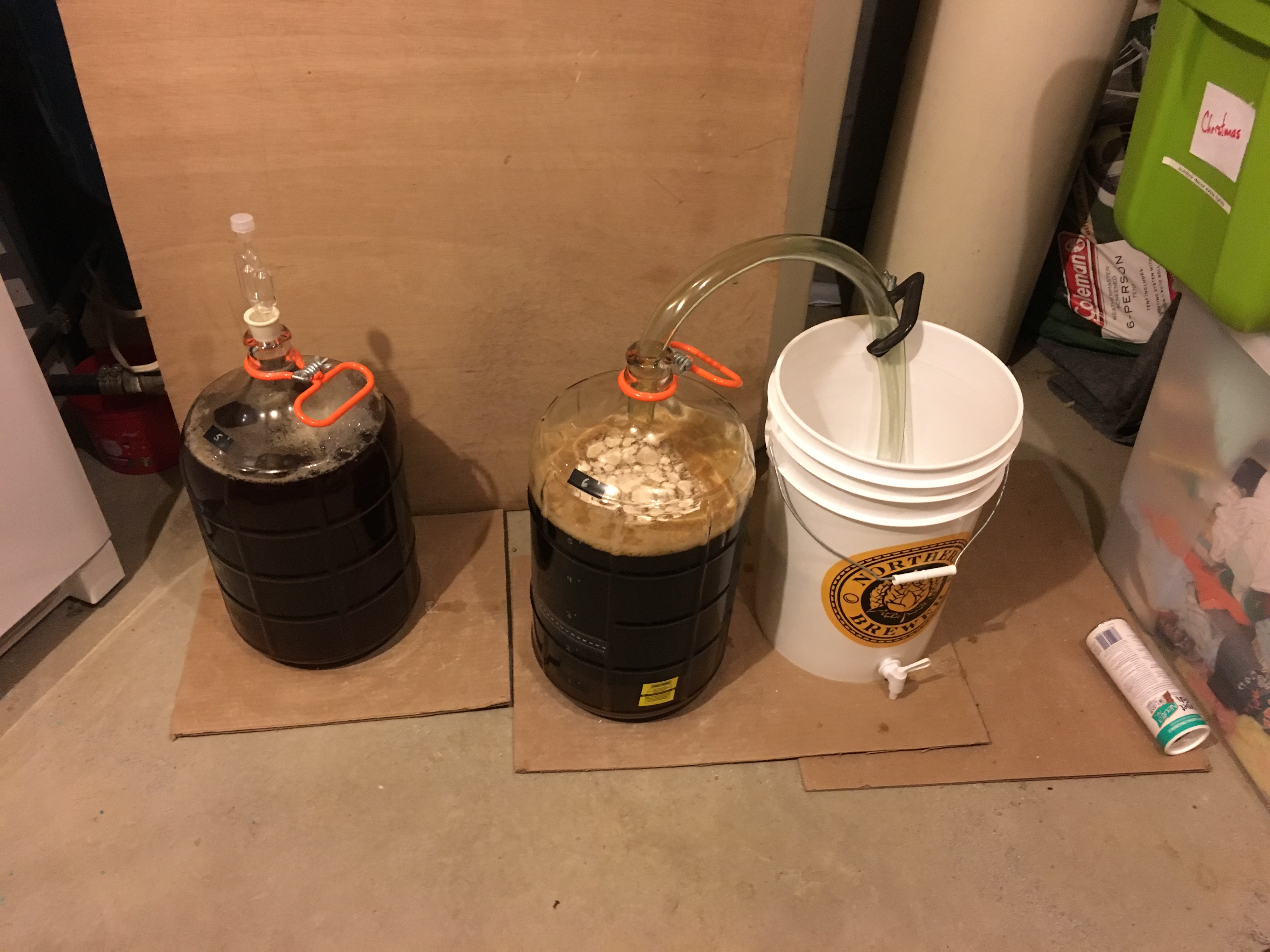 Once the wort is in the fermenter, it is topped off to 5 gallons, yeast is added, and it is stored in a cool, dark place for fermentation. In this case, my basement utility room. On the left is a grapefruit IPA that is in the later stages of fermentation. The stout is on the right. You’ll notice that the IPA has an airlock in the carboy opening. This is a one way valve that lets gas escape (carbon dioxide is produced during fermentation) but doesn’t let anything back in. For the stout, I used a blow off tube as I expect a vigorous fermentation. The tube is a wider channel and thus allows for a greater volume of escaping gas. The bucket contains liquid sanitizer and the end of the tube is submerged, preventing air flowing into the carboy. The wort will become beer over the next 8-10 weeks. There are a few more steps (adding bourbon soaked oak cubes!) but it is largely a waiting game at this point.
